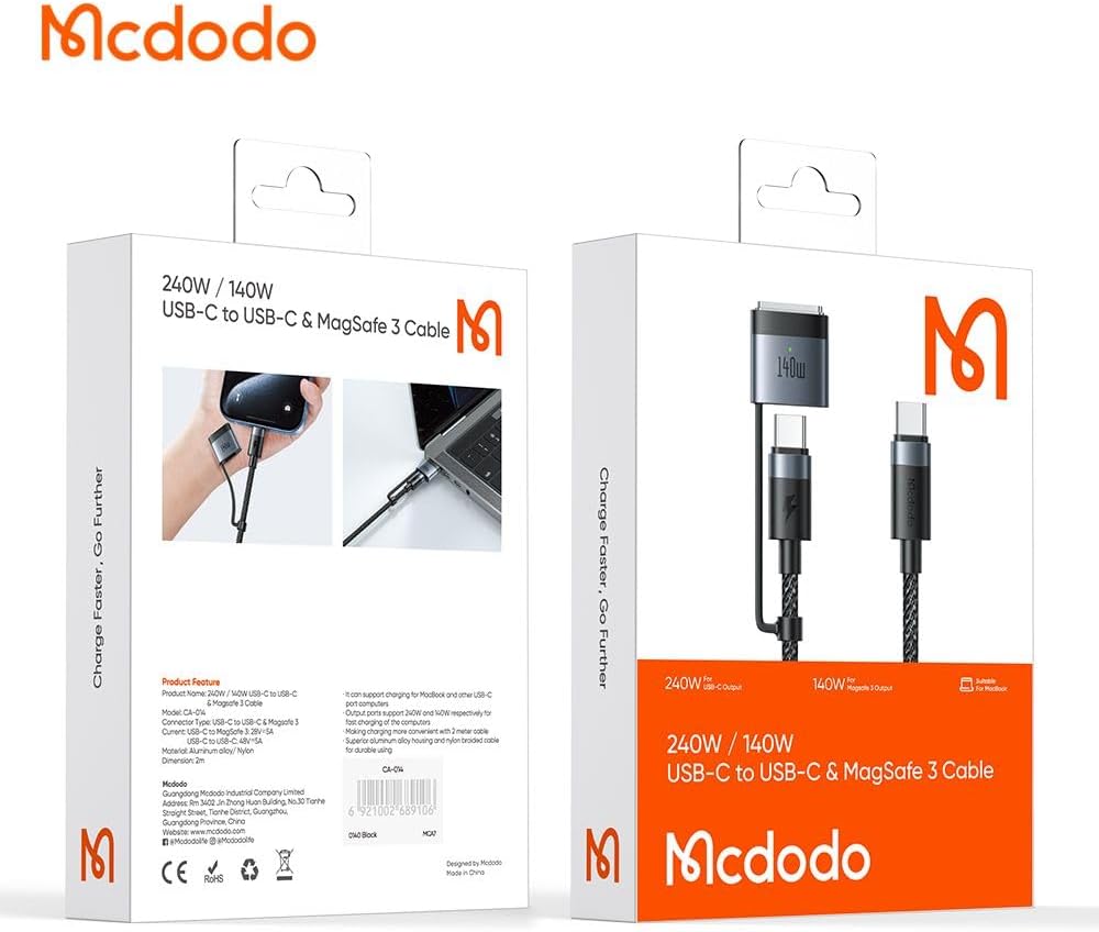Mcdodo MagSafe 3 PD3.1 240W/140W Charging Cable - 2-in-1 USB-C to MagSafe 3 Fast Charger for MacBook Air, MacBook Pro, iPhone 15 Series, and USB-C Devices | 2M Aluminum Nylon Braided